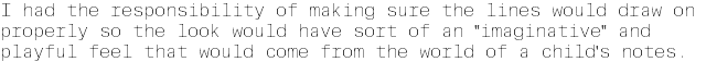 I had the responsibility of making sure the lines would draw on properly so the look would have sort of an "imaginative" and playful feel that would come from the world of a child's notes.
