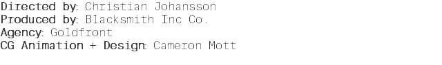 responsible for animation :42-:52 Directed by: Christian Johansson Produced by: Blacksmith Inc Co. Agency: Goldfront CG Animation + Design: Cameron Mott Programs: Photoshop CC Flash After Effects Illustrator
