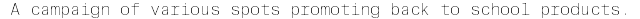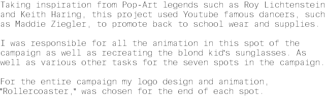 Taking inspiration from Pop-Art legends such as Roy Lichtenstein and Keith Haring, this project used Youtube famous dancers, such as Maddie Ziegler, to promote back to school wear and supplies. I was responsible for all the animation in this spot of the campaign as well as recreating the blond kid's sunglasses. As well as various other tasks for the seven spots in the campaign. For the entire campaign my logo design and animation, "Rollercoaster," was chosen for the end of each spot.