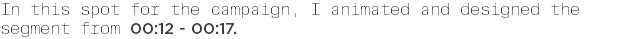 In this spot for the campaign, I animated and designed the segment from 00:12 - 00:17.