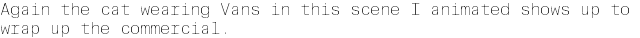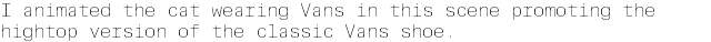I animated the cat wearing Vans in this scene promoting the hightop version of the classic Vans shoe.